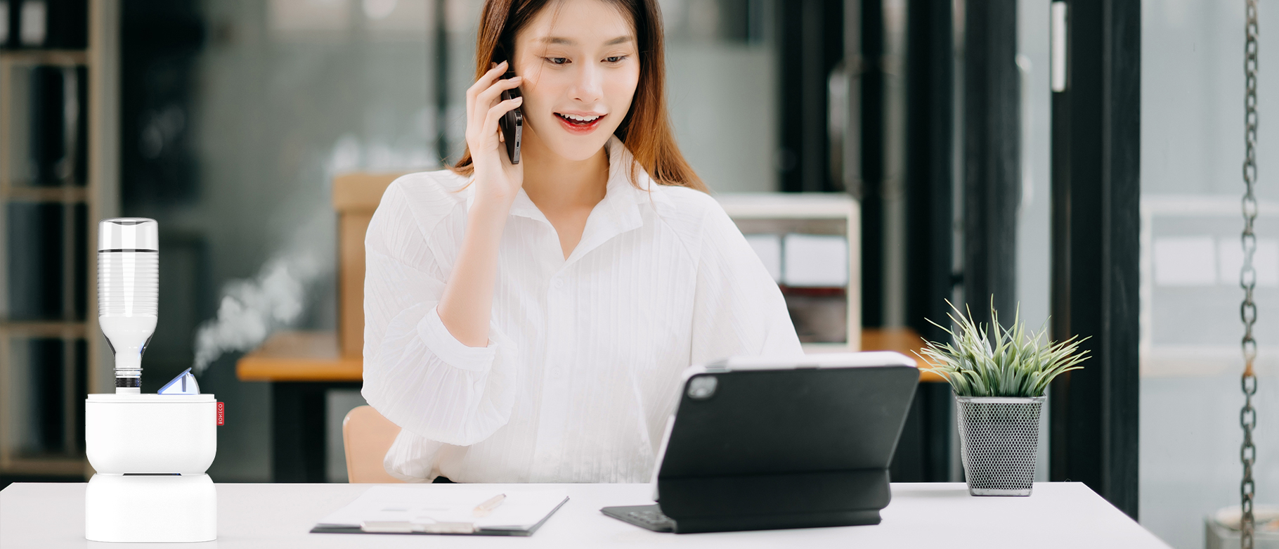 多數上班族長時間在辦公室裡,電腦、影印機等各種機器同時強力運轉著產生的高熱帶走空氣中大量的水氣,辦公室的濕度很容易不小心就低至30%上下,當你發現周圍的同事隨身都會準備保濕乳液或是保濕噴霧,但是大家還是感受到嘴唇乾燥、眼睛乾澀甚至還會不小心觸發靜電反應。