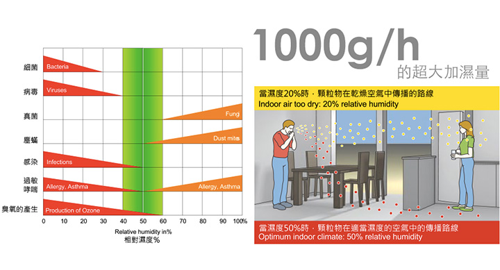 ↑ 圖表取自於 BONECO 台灣官網:顯示相對濕度落在 40~60% 區間對人體最沒有害處