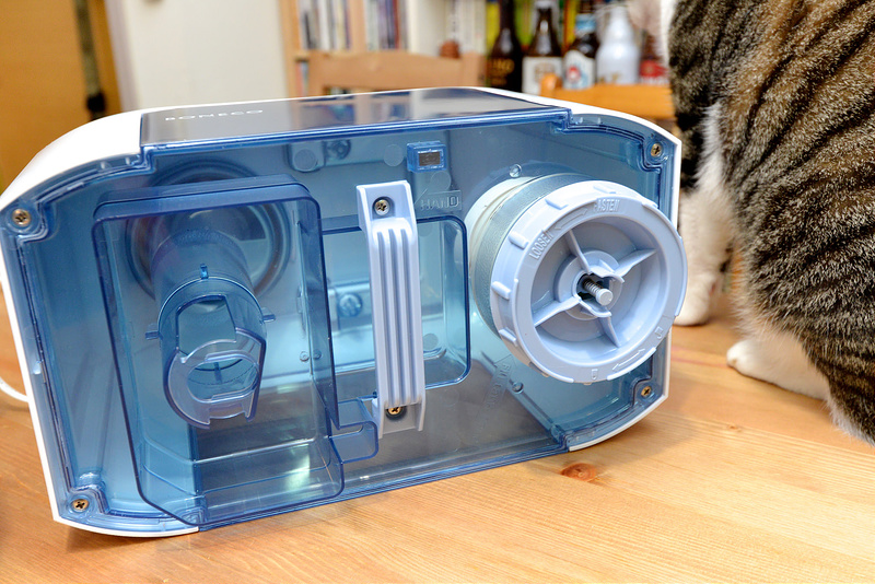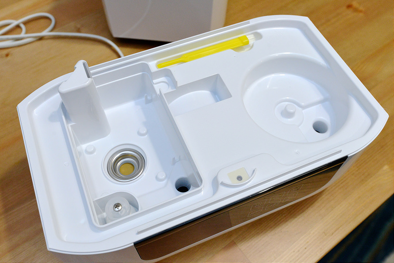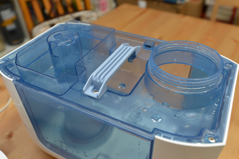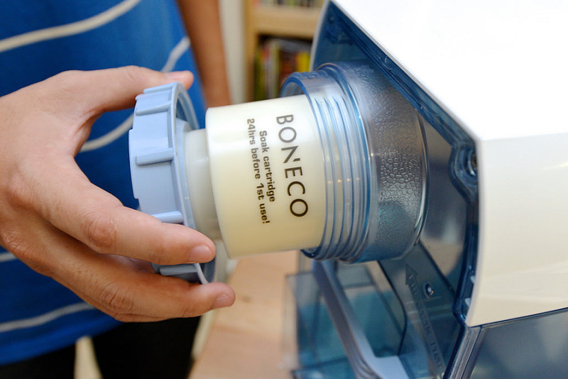→第一次使用,把除礦盒旋轉拿出,泡水24小時後使用。這個地方也是裝水的地方,可直接拿到水龍頭裝水,也可以放在桌上,用其他容器將水倒入即可。裝完水再將除礦盒裝入旋緊即可使用。除礦盒非常重要喔!主要是協助去除水垢及礦物質,保持震盪片效能,沒有除礦盒的話,震盪片使用ㄧ段時間很容易就會結水垢喔!另外這除礦盒是用無味樹脂製成,外殼還鍍有銀保護層,可防止細菌與微生物生長。可說是非常用心的設計。也算是耗材,可以查詢:瑞士BONECO DMC除礦盒 A7531,一個約600元。一樣是看家裡的水質狀況決定使用期限。